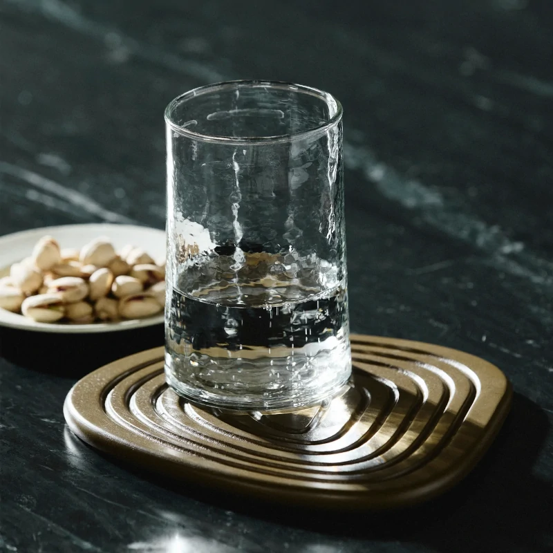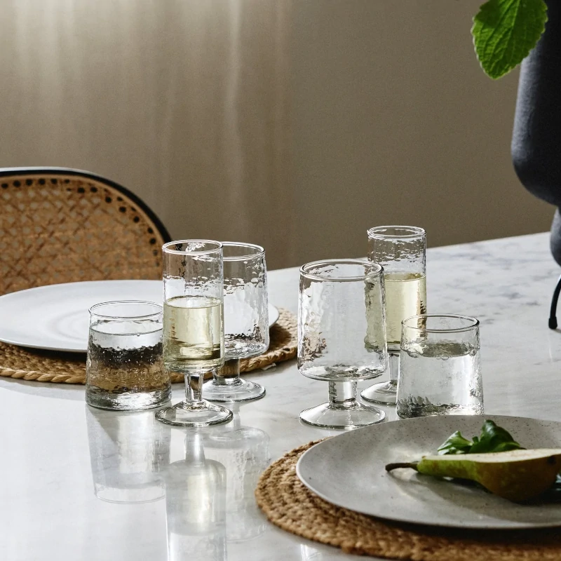 The elegant drinking glass is mouth-blown from 60% recycled glass and features a lightly hammered surface that adds character and tactility to your table setting.