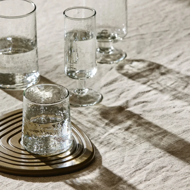 Each piece is unique, with slight variations in shape, thickness, and air bubbles – clear signs of the artisanal process that gives each glass its special charm.