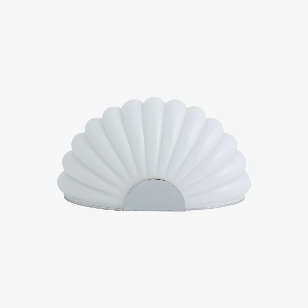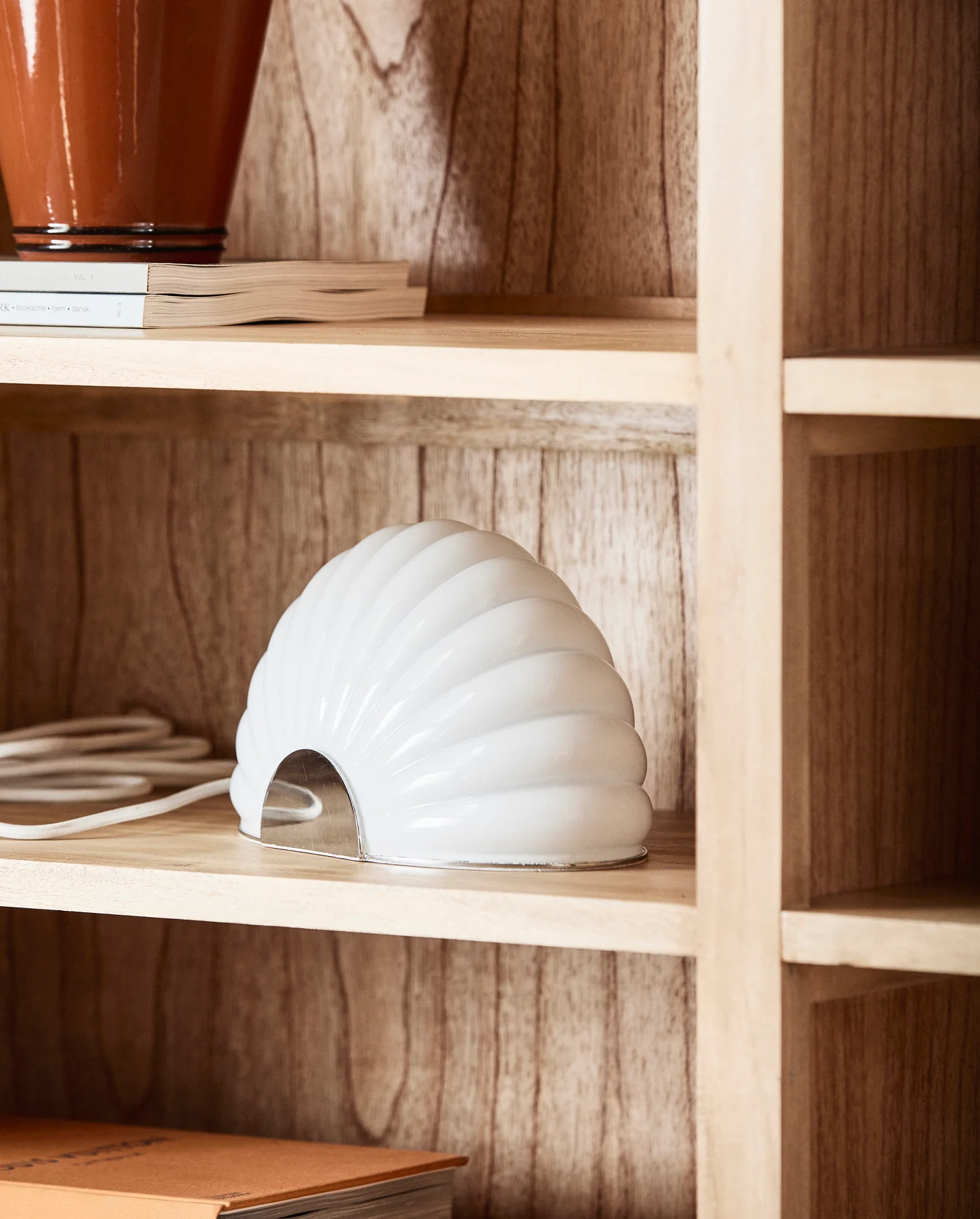 The lamp’s sculptural arch, with its grooves, references a seashell. It is designed with a milky white glass shade that emits a soft diffuse light. The lamp’s base is crafted in chrome, adding a touch of elegance. With its organic form and subdued light source, the lamp appears as both a sculpture and a lamp in your home.